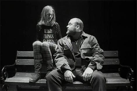 Poput samog dramskog teksta, čiji su prizori fragmentarni i prostorno razmješteni (radnja teče od bolnice, preko ljekarne, tramvaja, klupe na stajalištu tramvaja do privatnog stana profesorice hrvatskog jezika), predstava je odigrana u različitim prostorijama, a onda uživo prikazana na platnu u glavnoj dvorani. Napetost i intrigantost radnje tako je adekvatno potcrtana mijenjanjem kadrova. Poigravanje tehnikom i tehnologijom upućuje na koketiranje s filmskom režijom. Ipak, ispod platna se naziru cipele u kojima hodaju glumci (jedna od pozornica na kojima su glumci igrali bila je i ona iza projekcijskog platna), pa su gledatelji cijelo vrijeme svjesni stvaralačkog čina koji se odvija upravo pred njima. Povremeni upadi huligana iz predgrađa (koji su pandan letećim majmunima iz prototeksta) u publiku uzdrmavali su rampu i također podsjećali gledatelje da nije riječ tek o video prijenosu.