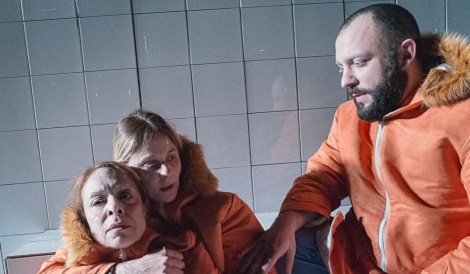 Predstava počinje scenom umiranja Katje, starije žene koju s odmakom, ali i mnogo nijansi uspjelo tumači Doris Šarić Kukuljica, posebno dojmljiva u tumačenju zanimljivog monologa o smrti i njenom dolasku. Iako se po tekstu čini da se to zbiva u domu za starije osobe, bijele pločice scenografije djeluju snažnije upućujući na mrtvačnicu. U njoj je ta žena na umoru (ili možda čak već mrtva) scenski potpuno uvjerljiva, dok Goran Guksić kao Bolničar (jedino emocionalno nehendikepirano lice) interesantnu ulogu ostvaruje pokazujući kako je teško na uobičajen način uspostaviti odnos prema stvarnosti koja se rasipa.