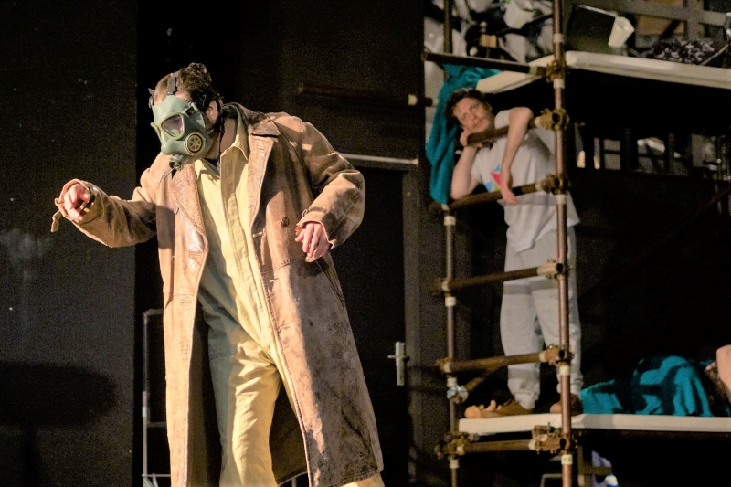 Postapokaliptična scenografija Alme Trtovac posve je u skladu s duhom predstave i služi svrsi te je puna sitnica i izuma koji dodatno sužavaju prostor podruma u kojem se radnja održava. Dva prozora kroz koja dopiru slabo svjetlo i dim služe i kao prostor za izlazak s pozornice / iz stvarnog svijeta i ulaz u njih, a ujedno i svjedoče o nehumanim uvjetima koji vladaju na otvorenom. Osim toga, na sceni se nalaze i funkcionalne metalne konstrukcije na kat, koje s jedne strane dijele prostor na podrum u kojem roditelji (Doris Šarić Kukuljica i Ozren Granarić) proživljavaju kataklizmu, dok se s druge strane nalazi hotelska soba zaljubljenog para koji se skriva od svijeta (Robert Španić i Sven Jakir) i uživa u zajedničkim trenucima.