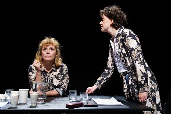 Spomenuta maksimalna redukcija likova provedena je doista radikalno. Naime, na samom početku predstave tri glumice (Ivana Krizmanić, Marina Redžepović, Maja Posavec) izvlače papiriće. Na sva tri napisano je isto ime – Mirjana, što gledateljima zorno pokazuje kako je samo Mirjana i ostala u igri. Oni „oko nje“, iako nisu nestali iz njezinog karaktera, iz njezinih misli i refleksija, uklonjeni su sa scene, čime se, dakako, ostvaruje maksimalni fokus na jedan lik. S druge strane, taj lik igraju tri glumice, čime je sačuvan koncept suigre i suodnosa. I baš kao što podjela lika između glumica naznačuje na samom početku, kako predstava napreduje – a traje kratko, nešto manje od sata, postaje sve jasnije kako se radi o suočavanju (više) ne samo lika sa samim sobom nego i autora sa svojim djelom, a još više s umjetničkim, kreativnim postupkom.