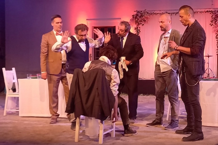 Sve se događa u postvrijeme, u vakuumu vjenčanja, u marginalnome prostoru mogućega slavlja koje se zbog spleta okolnosti ne može realizirati, u polupraznu restoranu sa šankom lijevo, bubnjevima i ukrašenim podijem za glazbenike u pozadini (uz režiju, Jasmin Novljaković potpisuje i scenografiju), bijelim stolicama i stolovima na sredini koji se povezuju, udaljuju i pomiču u nizu slika od koji se svaka prekida u svojoj kulminaciji, a između je njih mrak za glumačku, scenografsku i vremensku promjenu (oblikovatelj svjetla: Zdravko Stolnik). Multitalentirani glumci u nekoliko situacija tuge i/ili veselja uzimaju instrumente, zauzimaju glazbeni podij i organiziraju prave male koncerte koji visokom umjetničkom razinom pariraju onima u parku Ribnjak (suradnik za glazbu: Mario Mirković). Svaka je uloga idealno napisana za kvalitetnoga glumca, nudi bezbrojne varijante i omogućuje kazališne bravure, promjene identiteta, svaka uloga donosi na scenu neku životnu tajnu koja se postupno otkriva u dijalozima, monolozima, dramskim situacijama, što je čini kompleksnijom i životnijom, a smijeh izaziva prepoznavanje svakodnevnih situacija koje su dodatno bizarno zaokrenute.