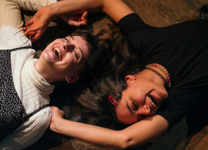 Djevojčice kritiziraju same sebe (što je posve razumljivo za njihovu dob prepunu nerealnih kompleksa) i suvremeni položaj žena u različitim društvima, simpatično bugareći o okrutnim reliktima patrijarhalnoga sustava u islamskim zemljama, gdje se žene nagrađuju modricama i krvlju za probuđeno muško jastvo kojemu je ego brojnik a posesivnost nazivnik. Mare će tu scenu prispodobiti dječjim oblikom mašte u obliku lijepljenja lica selotejpom koji predstavlja zavoje, a krvlju umrljanom plahtom predstavit će i burku i stvarnost islamske žene u pojedinim dijelovima svijeta. Na čemu onda predstava izrasta? Upravo na tom snažnom kontrastu, tj. procjepu teških tragedija ispričanih sviješću djevojčica s kojima se sve ono sumorno i deprimirajuće, sav onaj svjetski spleen transformira u britki humor. I prije nego što postanu mlade žene dolaskom prve menstruacije, tj. menarhe, Mare i Lenu kao da su već prilično informirane onim što i ne bi trebalo biti u fokusu njihova sazrijevanja, no društvene mreže kao glavni mentori usmjeravaju ih i na krive stranice i na lajkove-zamke. Falusne opsesije i progon tijela – kako ženskog, tako i muškog, mrtvozornici su suvremenoga ludila i društvene farizejštine od koje će se biti teško skloniti. Scena gutanja cigareta do zagušenosti ekspresivno će pred gledatelje iznijeti metaforu današnjeg vremena u kojem žene titraju između feminističkih pobuda i kulture mačizma, tražeći svoje mjesto pod suncem. Ima li razlike između modernog javnog linča žene kao bića za čiju se čednost treba moliti na trgovima i spaljivanja slobodoumnih vještica u gradskim sredinama baroknoga pa i prosvjetiteljskoga vremena, da ironija bude još veća? Mare i Lenu brzo iskaču iz utjelovljenja u utjelovljenje, donoseći pred oči ženske klinike sa svim mogućim scenarijima satirično prispodobljenima, pogotovo ako je riječ o sreći povodom rođenja muškoga djeteta, rugajući se pri tomu još uvijek prisutnim patrijarhalnim obrascima ponašanja i ukorijenjenim predrasudama na temu žensko-muških odnosa, prisutnima u mnogim svjetskim kulturama.
