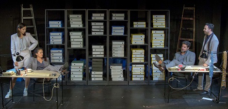 Iako zanimljive i uspjele strukture, ovako koncipiran tekst relativno je zahtjevan za postavljanje u kazalištu jer mora kombinirati scensku dinamiku i jasnoću razgraničenja uloga u složenom ispreplitanju razina odnosa Njega i Nje, a još više Njega i Onana te Nje i Onane. Redateljica Marina Pejnović pristupila mu je na promišljen i organiziran, no donekle repetitivan i statičan način, posebice u prvom dijelu predstave. On i Ona uglavnom sjede za svojim uredskim stolovima, rukuju papirima, dok se iza njih nalaze brda registratora koji formiraju i prijelaz između razina, jer se iza njih nalaze Onan i Onana. Ovakav postav scene (scenografkinja Liberta Mišan) omogućuje jasno percipiranje razina i shvaćanje pozicija četiriju glumaca, dvoje ispred (On i Ona) i dvoje iza zida od registratora (Onan i Onana). Tako predstava funkcionira kao dobro razumijevanje eksperimenta razina na kojem se temelji struktura drame, no donekle gubi mogućnost identifikacije i percepcije univerzalne ljudskosti likova na sceni, njihovu životnost. Kreativno korištenje scenske glazbe (skladatelj Vid Novak Kralj) i posebice svjetla (oblikovatelj Marijan Štrlek) u smjenjivanju i stvaranju daljnje distinkcije u razjašnjavanju razina, slijedi koncept i dobro naglašava odnos u kojem su On i Onan, odnosno Ona i Onana.