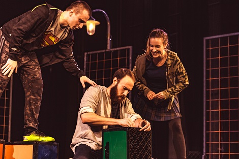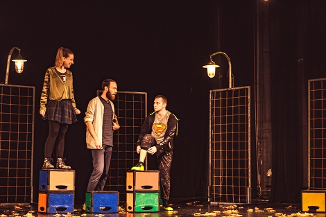 Damir Mađarić očistio je scenu i tekst od svih višaka i u suradnji s cijelim timom stvorio minimalističku cjelinu s izrazitom emocijom i snagom koja se prenosi na publiku. Radnja se odvija većinom u monološkoj formi u kojoj se likovi u potpunosti ogoljuju pred publikom, a svi ostali elementi samo diskretno podcrtavaju osnovne naznake vremena i mjesta - poput scenografije, koja se sastoji od nekoliko ograda po kojima se penju ili iza njih proviruju, i desetak gajbi koje služe kao sjedalice, prostor za pisanje, sredstvo za igru i tri ulične lampe. Kostimi se također uklapaju u današnji prostor i vrijeme radnje pa su suvremeni i mladenački, a glazba pridonosi emocijama i/ili najavljuje događaje – primjerice, glasna i brza glazba najavljuje opasnost. Predstava je najavljena kao 13+ zbog težine teme, određene zrelosti koja je možda potrebna za shvaćanje situacija likova i ponekih eksplicitnih fraza, ali gornja dobna granica svakako ne postoji. Ono što je meni zasmetalo jest činjenica da silna belgijska imena i prezimena nisu lokalizirana u hrvatska, jer prostor je neodređen i univerzalan a samo su imena specifična. Nekako su me ta strana imena na trenutke izbacivala i distancirala od likova i mislim da bih i ja, a i publika, još bolje reagirali na domaća imena. Jednako tako, još bi uspješnije bilo da se malo preciznije i detaljnije pozabavilo adaptacijom i dramaturgijom pa da se likovi više ogoljuju kroz situacije, akcije i reakcije a ne većinom u monološkoj formi. Pomalo dramaturški slaba kopča je i važan događaj kada trojku nakon rastavljanja ponovo spoji susjed za kojeg se prethodno kaže da ga nikad nema kod kuće i da stalno ili vježba ili putuje po svijetu.