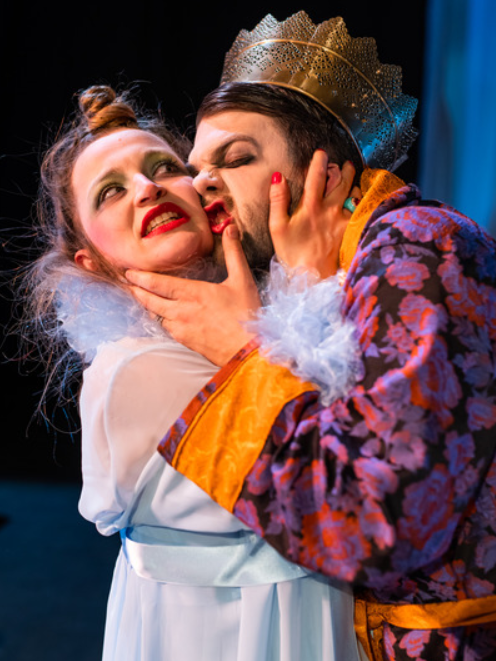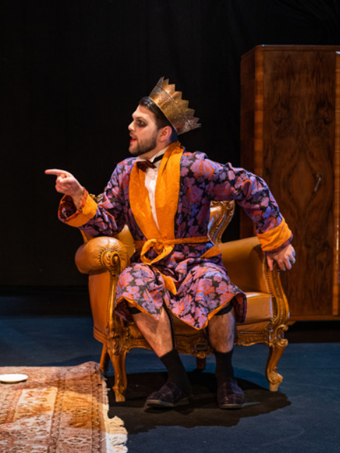 Ludilo bračnog para u predstavi očituje se, između ostalog, i u tome kako oni pijuckaju čaj i razglabaju o banalnim stvarima kao da pod njihovim prozorom ne pucaju granate i vani ne bjesni rat. Čekaju samo da se to smiri kako bi stavili na glavu svoje šešire tj. krune i otišli u šetnju kao da čekaju da stane kiša. Njezino je ludilo izvrsno prikazano u prizoru u kojem neprestano manijakalno češlja kosu, dok si on neprestano toči čaj iz kristalnog čajnika i ne skida krunu s glave, iako je čitavo vrijeme kod kuće i u kućnom ogrtaču.Iako ima krunu na glavi, ni po čemu se ne da zaključiti da je on doista i kralj, jer se uopće tako ne ponaša. Dosjetljivo je nasred scene postavljena WC školjka na koju oboje odlaze obaviti nuždu i time se daje dojam kako je njihov život neodvojiv, kako nema privatnost i koliko su njih dvoje, unatoč svemu, bliski.