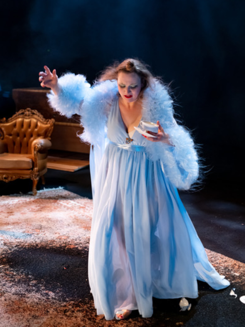 Nju i njega igraju Lara Živolić i Luka Mihovilović, mladi glumci koji s lakoćom uprizoruju bračni par i oduševljavaju prirodnošću. Živolić nije upala u zamku preglumljavanja iako igra neuračunljivu ženu, dok Mihovilović odiše karizmom itekako poželjnom za glumca. On je ujedno zaslužan i za odličnu režiju i scenografiju na kojoj je, uz njega, radio i Goran Šaponja.Iako se radi o Maloj sceni na kojoj su postavljene svega dvije fotelje, toaletni stolić, dva ormara i stolić za čaj, uspjeli su uz pomoć zvuka vjerno dočarati i granatiranje, vjetar, otvaranje balkonskih vrata… Dosjetljivo su postavili cijevi iznad scene, iz kojih pada čađa za vrijeme granatiranja.