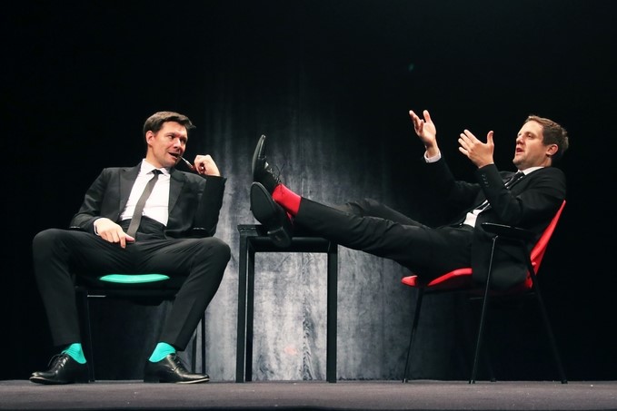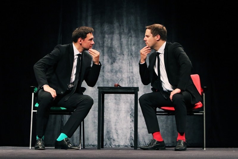 Odmak od te ozbiljnosti scenografkinja i kostimografkinja Anja Planinić naznačila je živim bojama čarapa i fotelja – zelenom za Marka Hergešića i crvenom za Filipa Detelića. Žive boje čarapa na tamnom odijelu često se koriste u klaunskom izričaju, a sramežljive naznake klaunerije bile su vidljive i u izvedbi dvojice glumaca i žao mi je da se taj bogati potencijal komičnog fizičkog teatra s njima nije više razradio te da se nisu više poigrali, kako naziv predstave govori, s Harmsom, odnosno s likovima koje spominju te samom izvedbom. Umjesto toga, Boris Kovačević, koji potpisuje i dramaturgiju, htio je ispričati što više priča te je glumce opteretio tekstom a ostavio im je premalo vremena za neverbalnu igru koja bi se, smatram, scenski sjajno slagala s Harmsovom komikom. Zahvaljujući njihovoj umješnoj i brzoj transformaciji tijela i glasa, međutim, pred publikom je prodefilirala galerija vrlo raznolikih likova prema kojima se, zbog naglašene karikaturalnosti, osjetio ironijski odmak samih pripovjedača. Pogrbljen i mrgudan stari je grobar, ukočen i zbunjen sveučilišni je profesor – to su samo dva, od mnogih primjera, a svaki je muški lik bio prikazan drugačije. Razlikovali su se prema hodu i načinu govora, neki od njih bili su prikazani s više a neki s manje humora. Nažalost, to se ne može reći za ženska lica koja su, iako ih nema mnogo, bila dočarana istom stereotipnom gestom i visokim tankim glasom bez ikakve razlikovne nijanse.