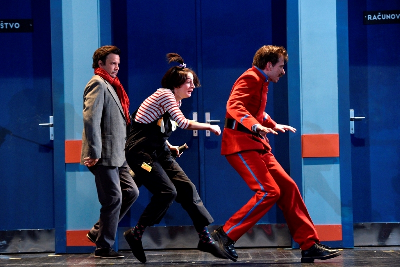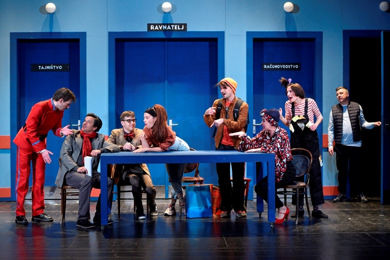 Radovan Ruždjak napravio je vrlo dojmljivu ulogu redatelja, očajnog i sluđenog od neorganizacije i kaosa, s kojom su se odrasli gledatelji, naviknuti na trome institucije, mogli poistovjetiti. Njegov je lik promijenio najviše emotivnih stanja – od uzbuđenja do živciranja, očaja i euforije, od umišljenosti do gubitničkog osjećaja, što je Radovan Ruždjak iznio vrlo energično i duhovito. Tvrtko Jurić svojom je tjelesnom posturom stvorio pravu sliku ravnatelja kao političara i menadžera koji ne mari previše za probleme podređenih, a izvrstan je i u ulozi starijeg, neambicioznog, prilično istrošenoga glumca. Za razliku od posvećenih glumaca, on svoj posao odrađuje kao što bi odrađivao svaki drugi, bez imalo strasti i zanosa, ali zato gaji ljubav prema hrani, što je Tvrtko Jurić iznio vrlo komično.Tajnice (Aleksandra Naumov i Daria Knez Rukavina) prikazane su karikaturalno, stereotipno tumačeći jednu lijenu djelatnicu koja osam radnih sati lakira nokte i vodi privatne razgovore te drugu koja se guši od posla. Njihovi su prizori osmišljeni u estetici animiranih filmova, takvi su i glasovi glumica, a i humor koji proizlazi iz njihove igre. Aleksandra Naumov pojavljuje se i kao scenografkinja u potpuno drukčijem glumačkom kodu koji se naslanja na komiku fizičkog pokreta, a Dubravka Lelas kao inspicijentica i šaptačica komiku je gradila u potpunom odmaku od realnog, s pomoću pokreta, brzih koraka i još bržega govora te je njezin, iznimno zanimljiv lik, odudarao od ostalih i najviše se približio estetici animiranih filmova.