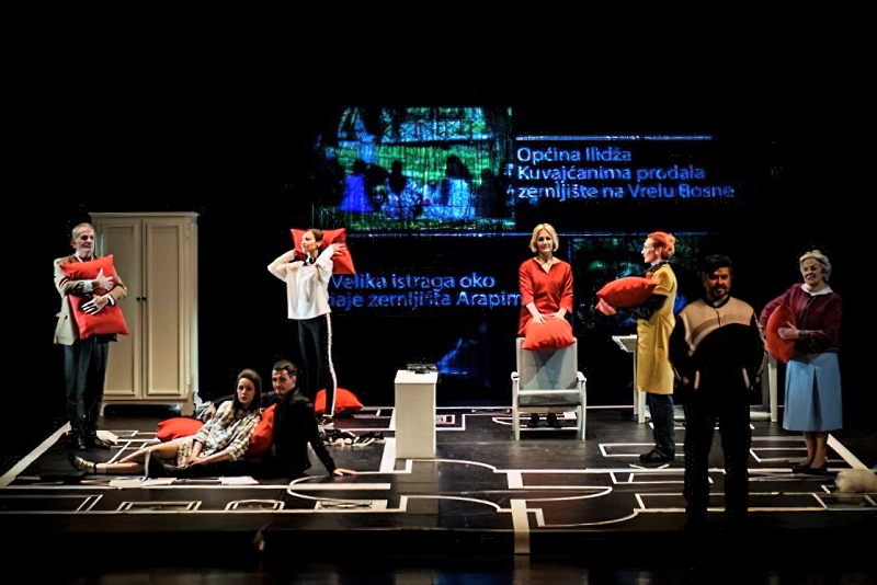 Glumci sevdalinku na početku predstave izvode na rampi, skrivajući pogled na povišenu scenu koju potpisuje Mirna Ler, a na kojoj će se, kada se odmaknu, otkriti niz crvenih jastuka koji čine glavni simbolički element. Jastuci su pobacani po stanu sarajevske obitelji čiju sudbinu pratimo, a prostorije u stanu su precizno iscrtane kredom na podu, da bismo dobili savršeni tlocrt prostora iz kojeg nema izlaza za većinu članova obitelji. Ovdje ne mogu ne spomenuti Tri sestre velikog ruskog redatelja Timofeja Kuljabina, predstavu izvedenu prošle jeseni u sklopu Festivala svjetskog kazališta na sceni zagrebačkog HNK, a u kojoj su također prostorije na sceni bile označene kredom. Great minds očito think alike…