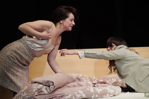 Dvije glumice, Jovana Belović i Sanja Marković, na sceni su tijekom dramskoga događanja uigrano usredotočene na karaktere koje tumače čitavih sat i pol vremena, koliko traje predstava. Okružene su minimalnom scenografijom (bračni krevet slojevito pokriven presvlakama plahti, deka i popluna, u desnome kutu pozornice otvorena ormar vješalica s nekoliko komada ženske garderobe i cipela) koja evocira bračnu spavaću sobu. U spavaćoj se sobi, na krevetu i oko njega, pred publikom odvijaju cjelovite životne priče različitih žena, dramskih likova – priče su ujedno i epizode, samostalne cjeline unutar ove duodrame.