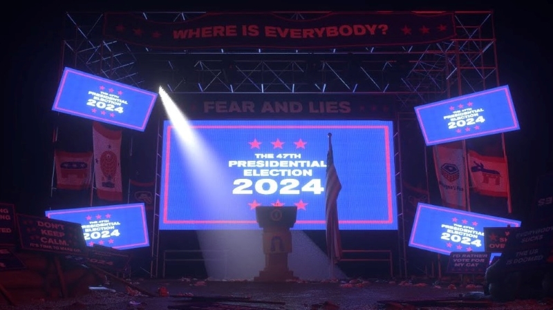 Bartlett radnju svoje najnovije drame, praizvedene ovoga proljeća u Old Vicu, smješta u blisku budućnost u kojoj sadašnji američki predsjednik Joe Biden zbog bolesti vlast prepušta zamjenici Kamali Harris, a istodobno se u borbu za novi mandat ponovno uključuje Donald Trump, preotimajući republikansku nominaciju od Teda Cruza.