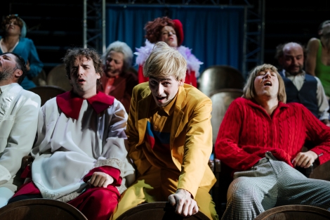 Vidimo glumce odjednom kao fašiste s ricinusom, ali i muškarce koji se lažući prikradaju zanosnim ženama (vješt i uvijek karakterno precizan Jasmin Mekić). Među malim, ali velikim junacima scene su i mjesni govorljivi odvjetnik (nagrađivani Mario Jovev), odlučna, sigurna u svim svojim nastupima i širokogrudna trafikantica (poput oživljene i uživljene komične lutke donosi je Serena Ferraiulio), senzualna i damski nastrojena Gradisca i njezina prilijepljena prijateljica (glume nagrađivana Tanja Smoje i Ivna Bruck), mlada Volpina koja razotkriva svoju mladenačku putenost (Aleksandra Stojaković Olenjuk). Posebnu hvalu treba izreći glumici Biljani Lovre koja je, glumeći djeda, metamorfozično dala karakteru sve muške osobine gestama, govorom i kostimom. I na kraju, kao blagoslov, u duhu karaktera koji nosi, tu je i glumac Giuseppe Nicodemo (glumi i svećenika i fašističkoga vođu).