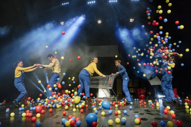 Predstava započinje šokantnim uprizorenjem tog ishodišnog prizora, djelujući izvanredno spektakularno u začudo vrlo jednostavnoj (gotovo komornoj) scenografiji Marije Kalabić kojom naspram tamne pozadine dominiraju dvije podignute proizvodne trake. One će zavisno od zbivanja na sceni često djelovati i kao tobogani, a uz njih su žene i muškarci u plavoj odjeći koja je maštovita varijacija na izgled tvorničkih kuta. Jednako originalno i atraktivno djeluje i vrlo inventivna kostimografija Selene Orb, posebice u scenama koje prikazuju drugačije žene i muškarce, uspijevajući stvoriti neočekivano znanstvenofantastično ozračje.