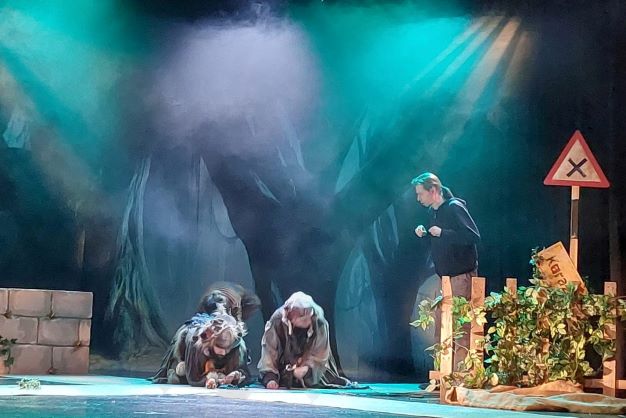 Nova predstava Dječjeg kazališta Dubrava, najavljena kao lutkarska predstava, iako ne mislimo da je to precizna žanrovska odrednica, za djecu 7+ premijerno je izvedena 3. ožujka, a mi smo je pogledali na prvoj reprizi koja nije do kraja ispunila sva gledališna mjesta. Predstava redateljice Ivane Peroš inspirirana je pričama iz bogate hrvatske narodne predaje, a nastala je prema knjizi Mjesečeve sjene Zdenka Bašića koji je i dramatizirao tekst. Predstava počinje mistično, u polumraku, gotovo filmski intrigantno, iako pomalo nejasno i nerazgovijetno. Scenografija (scenografkinja Vesna Režić, asistentica scenografkinje Nikolina Kuzmić) pokušava ispreplesti mistični i stvarnosni svijet, donekle je funkcionalna, ali podsjeća na realistične predstave nekog drugog stoljeća, sa statičnom drvenom ogradom, plotom za skrivanje desno i zidićem za skrivanje lijevo na sceni. Scenu i kretanje glumaca tako donekle onemogućuju dva statična scenska rješenja, a križanje svjetova o kojemu se stalno govori nije prezentno i jasno domišljeno. Mizanscena je zamišljena plošno, više u lijevo-desnoj orijentaciji, tako da izostaje perspektiva i treća dimenzija, planovi koje je moguće postići i na tako maloj, ali lijepoj i za manje predstave funkcionalnoj pozornici. Kazališni kodovi pomalo su nedorečeni.