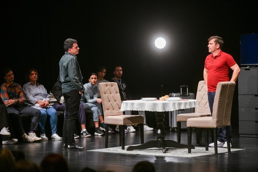 Na početku se činilo da je predstava pirandellovski koncipirana; naime, na Kerempuhovoj pozornici po desetak ljudi sjedi lijevo i desno, u maniri povlaštenih, involviranih gledatelja i sa svojih izloženih, uključujućih pozicija prati radnju, dok ostali gledatelji gledaju i njihove (ne)reakcije i prate predstavu, intimnu dramu triju dramskih osoba – majke, oca i sina. Vjerojatno se, međutim, ipak nije težilo kazališnome eksperimentu, nego je takva pozornica, naslućujemo, rezultat malih pozornica u kojima Hartefakt iz Beograda igra svoje predstave u kojima je publika, isto pretpostavljamo, s triju strana, a oni su u svojevrsnome ringu. Takvih smo zagrebačkih predstava i gostovanja u Zagrebu gledali dosta, u &TD-u, u Gavellinu atriju (nadajmo se da ćemo ponovno imati tu privilegiju), ZKM-u, HNK-u.... Publika na pozornici (slučajno ili neslučajno izabrana) pomalo je zbunjena, pomalo koncentrirana, znajući da ne smije remetiti koncepciju ni glumaca ni gledateljske većine – u kojoj je bilo nekih komešanja i negodovanje za vrijeme izvedbe (nismo razumjeli zašto – jesu li negodovali zbog (ne)kvalitete ili nekih neslaganja s predstavom), a bio je čak i jedan uzvik: „Dobar tek“ iz publike, na koji se glumci nisu, naravno, ni osvrnuli.