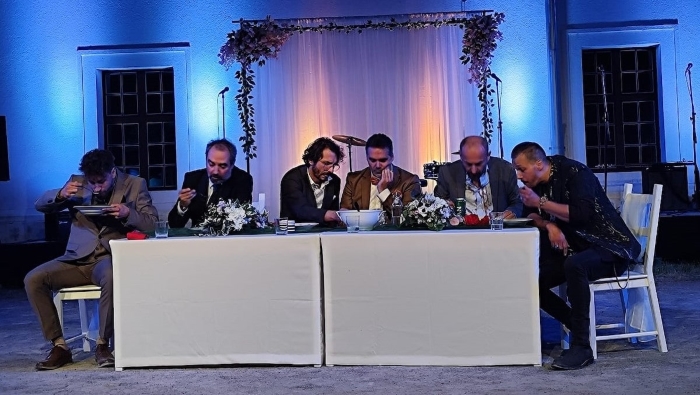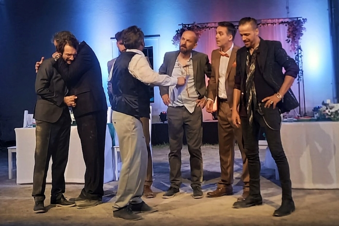 Sve se događa u postvrijeme, u vakuumu vjenčanja, u marginalnome prostoru mogućega slavlja koje se zbog spleta okolnosti ne može realizirati, u polupraznu restoranu sa šankom lijevo, bubnjevima i ukrašenim podijem za glazbenike u pozadini (uz režiju, Jasmin Novljaković potpisuje i scenografiju), bijelim stolicama i stolovima na sredini koji se povezuju, udaljuju i pomiču u nizu slika od koji se svaka prekida u svojoj kulminaciji, a između je njih mrak za glumačku, scenografsku i vremensku promjenu (oblikovatelj svjetla: Zdravko Stolnik). Multitalentirani glumci u nekoliko situacija tuge i/ili veselja uzimaju instrumente, zauzimaju glazbeni podij i organiziraju prave male koncerte koji visokom umjetničkom razinom pariraju onima u parku Ribnjak (suradnik za glazbu: Mario Mirković). Svaka je uloga idealno napisana za kvalitetnoga glumca, nudi bezbrojne varijante i omogućuje kazališne bravure, promjene identiteta, svaka uloga donosi na scenu neku životnu tajnu koja se postupno otkriva u dijalozima, monolozima, dramskim situacijama, što je čini kompleksnijom i životnijom, a smijeh izaziva prepoznavanje svakodnevnih situacija koje su dodatno bizarno zaokrenute.