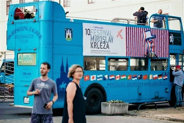 Putnici-gledatelji su, putujući ulicama kojima se nikad ne bi mogli voziti tramvajem, na autobusnom pijedestalu izazivajući divljenje prolaznika, motrili sliku o Krleži na jedan potpuno nov način, gledajući iz druge perspektive jedan zapravo novi grad, proširujući vizuru i kreirajući novu, treću dimenziju posebnoga puta. Autobusom je publika dalje preko zagrebačkoga Donjega grada, Ilice i Britanskoga trga došla do Krležina Gvozda 23 koji kazališno neiskorišteno stoji nakon oštećenja od potresa 2020. i spustila se slavnim dvorištem s asocijacijama na neke davnije dane Festivala do Dubravkina puta i spomenika Krleži Marije Ujević Galetović i Mesničkom i Ilicom zatvorila krležijanski krug u Plesnome centru u Ilici 10, od Radićeve ulice i Krležina rođenja prije 130 godina do susjednoga početka Ilice. Trosatnim tradicionalnim Putovanjem Krležinim zagrebačkim adresama publiku su Krležinim riječima vodili izvrsni glumci, Jelena Miholjević, uvijek potpuno posvećena tekstu, toploga glasa i ugodne energije i dostojan i dostojanstven glumački partner Nikša Marinović, a sveučilišna profesorica arhitektonske teorije Karin Šerman dodala je iznimnu znanstvenu dimenziju, izvrsno pripremljena, inspirativna, stručna i nenametljiva, uz stalnu nazočnost Gorana Matovića, autora i ravnatelja Festivala MK bez kojega Festivala ne bi bilo.