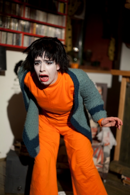 Fizički relativno mali prostor multifunkcionalno postaje soba u kojoj Nika Ivančić kao Valeska Gert daje, samo djelomično naznačen u komunikaciji, intervju, na šarenoj fotelji postavljenoj lijevo, s miljeima na naslonima za ruke i glavu, pridruženim stolićem sa šalicom, crnim telefonom, lampom, s haljetkom-pokrivačem i polucilindrom na podu još više lijevo, samostojećom lampom, raznovrsnim tepisima po kojima je razbacano puno rasparanoga papira i novina, kao i knjige i ploče. U sredini je, malo dublje, šank od cigli s natpisom Ziegenstall (Goat Shed), što je naziv kabareta koji je otvorila na otoku Sylt, a iza njega vješalica za kostime; desno su dvije stolice nejednake visine, s lampom, šalicama, knjigama, drvene ljestve na koje je stavljen šešir, na podu ispod njih velika staklenka u koju su ubačene novine, retro posuda za mlijeko, i još puno novina i knjiga.