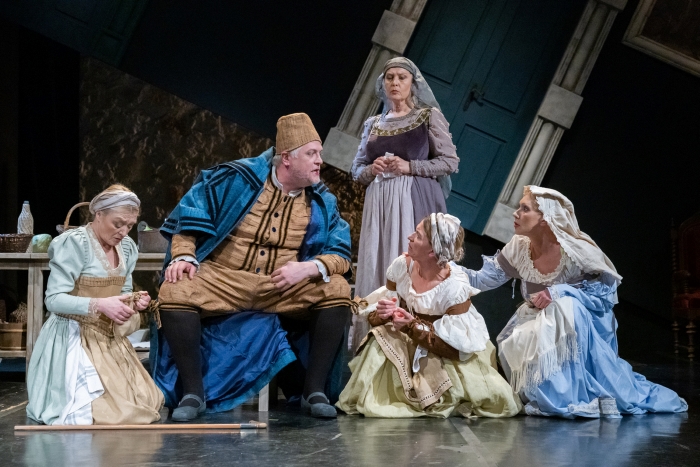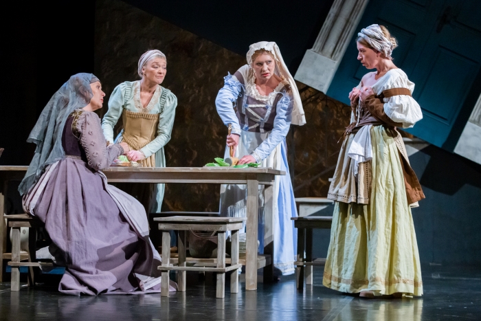 Jednostavan je scenografski prinos Iva Knezovića koji protagonistima ostavlja prazan prostor s nekoliko komada stilskog renesansnog namještaja namijenjenog gospođama i prosti drveni stol (kako bi se reklo – trpezu) oko kojeg se okupljaju sluškinje dok u pozadini, kao prijeteća kulisa, prostor ispunja oslikani zid s vratima koja se ne otvaraju s fragmentima slika i skalinima koje negdje vode i niz koje se od nekuda dolazi. Vrijedan je, vizualno atraktivan, kostimografski prinos Doris Kristić s dopadljivim i lijepim kostimima u kojima se kreću dubrovačke vladike jednako kao i likovno čisto, dosljedno i dopadljivo ruho njihovih sluškinja. Glazba Žarka Dragojevića unekoliko je suprotna vremenu kojem se drama događa ali upravo takva, zanimljiv je kontrapunkt povijesnoj razglednici u kojoj su zatečene i iz koje izlaze plemkinje i njihove pratilje. Maro Martinović kao jezični savjetnik obavio je besprijekorno svoj posao, pa je dubrovački govor i u tonu i u melodiji jedna od dodatnih vrijednosti predstave.