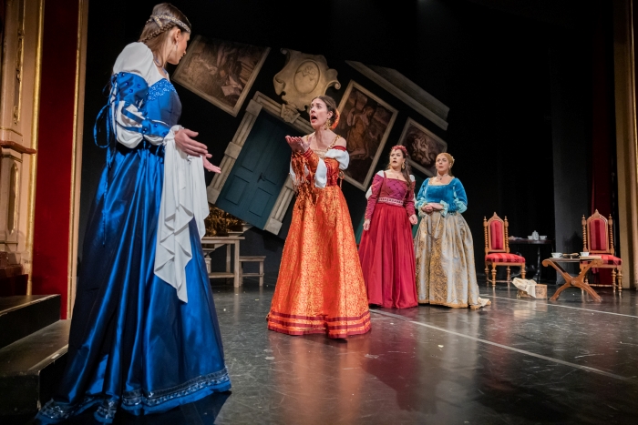 Redateljica Aida Bukvić vješto se snalazi u takvoj dramskoj konstrukciji s obiljem dijaloga, komentara i ispovijedi kvarteta gospođa ali i njihovih sluškinja, nižući i ispreplićući njihove sudbine, zbilje, iluzije pa i snove u kojima je, iz raznih razloga, uzroka i motiva, Cvijeta Zuzorić tek inicijalni izgovor za vlastita prepoznavanja, suočavanja i otkrivanja. U dugim „ženskim razgovorima“ i prijeporima i sveprisutnoj pa i opsesivnoj uzaludnoj Potrazi za Cvijetom, svoje mjesto i ulogu imaju i drugi znameniti Dubrovčani kao što su Monaldi, Ranjina ili Amatus Lusitanus ali i pjesnik Sabo Bobaljević Glušac (Savino de Bobali Sordo) – pisac Ljubavnih i pastirskih pjesama i satira i Jeđupke (u kojoj se obraća samo jednoj „gospoji“), soneta i poslanica (Pelegrinoviću, Mažibradiću) koji je jedini muški lik u predstavi i koji, kako zbog svoje bolesti (sifilis) i gluhoće ali „strastvene i rušilačke retorike“, ironije pa i sarkazma, ostaje jetkim komentatorom, povremenim sudionikom ali sveprisutnim svjedokom. Tim više ako je vjerovati nekim povjesničarima da nije bio, kao njegovi iz Akademije složnih koju je osnovao, toliko fasciniran Florom Zuzzeri. Složena je tako predstava uglavnom odvojenih prizora i dijaloga sluškinja i gospođa, ali i njihovih međusobnih odnosa, kada se klasne razlike zbog iznenadnih okolnosti i trenutaka nužnih međusobnih upućenosti, zatomljuju i potiskuju a ženska solidarnost funkcionira više kao iznimka nego pravilo. Na simboličan način, u samim završnim kadrovima predstave, plemkinje ostaju bose a sluškinje budu darivane njihovim skupim postolama. Enigma Cvijete Zuzorić ostaje neriješena. Očekivano. Možda bi ritam izvedbe bio dinamičniji pa i poželjno fluidniji i tečniji da se nije inzistiralo na povremenim dugim dijalozima, mjestimičnim ponavljanjima i ustrajavalo na faktografskim detaljima i kronologijama kojima su unekoliko pojednostavljeni složeni i suptilni karakteri likova, njihove emocije, empatije pa i zavisti i podmetanja, imanentna takvom vlasteoskom krugu, Gradu i podneblju koje ih je iznjedrilo.