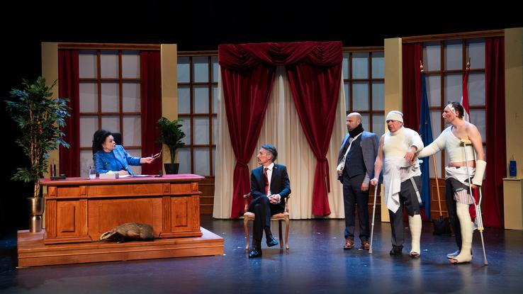 Komediju Pljuska Nenada Stazića izvelo je Satiričko kazalište Kerempuh u svome matičnome kazalištu, s malim, ali moćnim i kvalitetnim glumačkim ansamblom u kojemu su se posebno istaknuli, u ovoj grotesknoj političko-jezičnoj satiri, Elizabeta Kukić, majstorica glume i u sporednoj ulozi, kao i Željko Königsknecht, majstor glume, ujedno redatelj predstave (asistent redatelja: Darko Stazić), uz ostale glumce-sukreatore: Luka Petrušić, Damir Poljičak, Dražen Čuček.