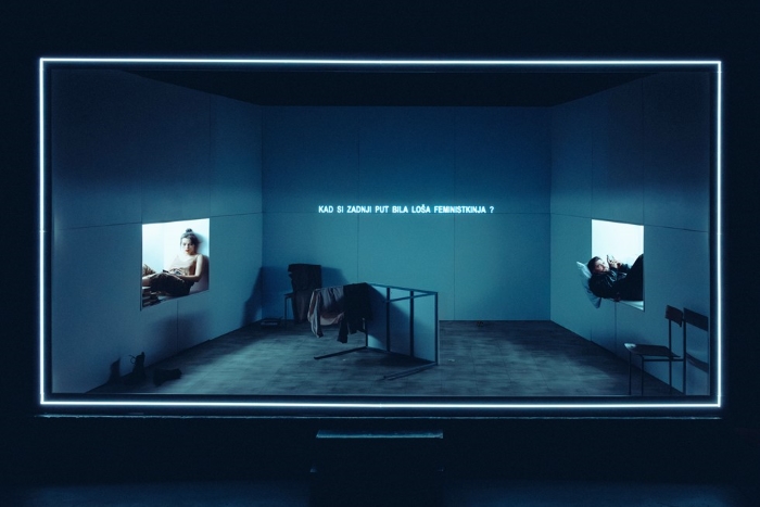 Konverzacijski okvir predstave počiva na primamljivu kontrastu: On, torcidaš, teško razmiče draču neuspjelih doskočica ne bi li kako u svoju mrežu namamio Nju, zagriženu feministicu, intelektualnim statusom zadovoljnu mladu ženu, ali ne i radosnim mirom odveć ispunjenu. Kompletnu doživljaju aktera na sceni snažno pridonosi i nenametljiva kostimografija Anite Gorete: prljave starke i vjetrovka nasuprot martensicama i mantilu stroga kroja, upotpunjuju virtualni dijalog početno naelektriziran izrazitom averzijom, svjetonazorskim kolizijama i potpunom nespremnošću za asertivnim jezikom uljuđene komunikacije.