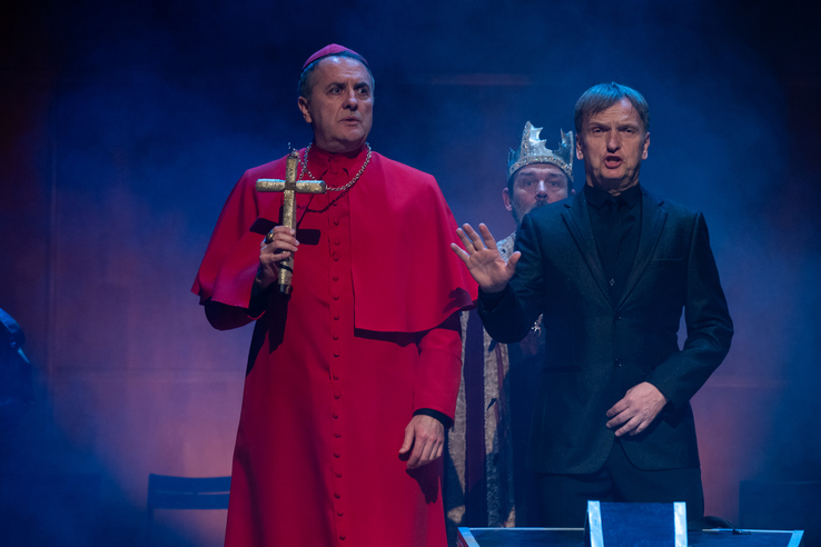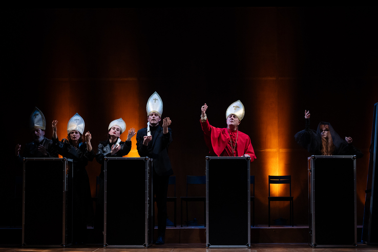 Predstava obiluje vizualno impozantnim i anti-realističkim rješenjima kakva kazalište posebno dobro podnosi (primjerice – vizual kardinala (Tarik Filipović) koji postaje doslovni nadčovjek, visoka i široka figura s masivnim zlatnim križem oko vrata koji je, paradoksalno, ujedno i izvor neumjerenosti i poroka).